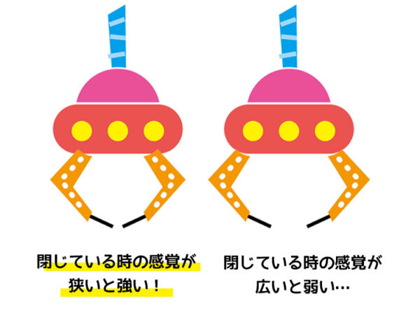クレーンでアームが閉じている時に爪同士の感覚(距離)が近いほどアームが強いと言われています。
