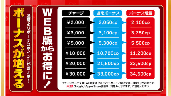 2万円課金なら1000CP・3万円課金なら1500CPお得!