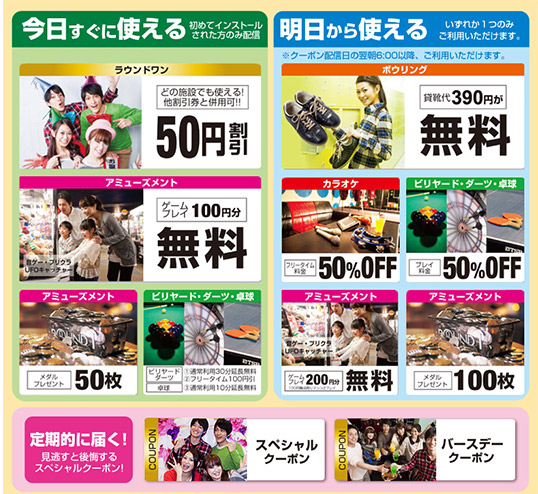 ラウンドワン公式アプリをインストールでクーポンをもらえます。