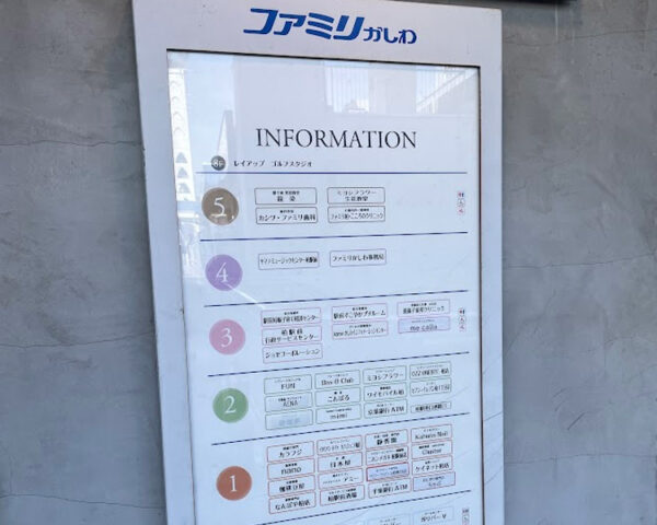 | 住所 | 〒277-0005 千葉県柏市柏1丁目1−11 ファミリかしわ内 B1F |