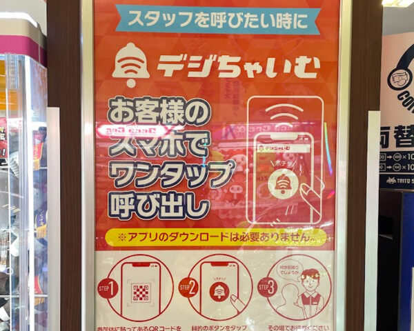 ここのタイトーステーションでは「デジちゃいむ」を使ってアプリのインストール無しで手軽に店員さんを呼べるのでめっちゃ便利です!