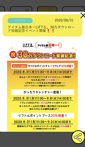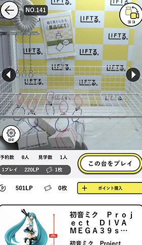 LIFTる。はアミューズメントマシンのレンタルやプロモーション事業をしている株式会社ミダスエンターテイメントの運営しているオンラインクレーゲームアプリになります。