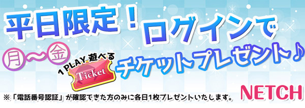 +月曜の9:30~21:30にログインするとチケット1枚(期限1日)が貰えるので、タイミングと景品のポイント合えば最大3回はプレイ出来ます!
