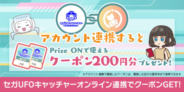 同社のセガが出しているオンクレのセガUFOキャッチャーオンラインとプライズオンのアカウントを連携することで、さらに200円分のクーポンももらえます。