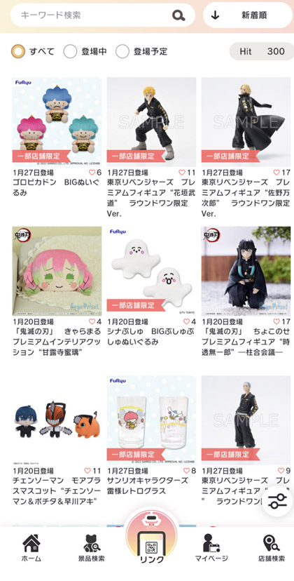景品検索ボタンをタップすると現在登場しているプライズとこれから登場予定のプライズが確認できます。