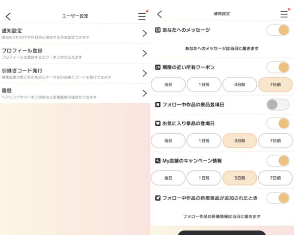 通知に関してはメニュー内の「ユーザー設定→通知設定」でお好みの内容・通知頻度を調整することが可能です。