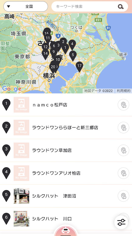 画面右下の「店舗検索」をタップすると、これだけで位置情報を取得して今いる近くの店舗を表示してくれます。