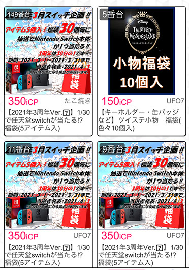 | 任天堂Switch | 設置:有り(抽選) 1PLAY料金:350円相当 |