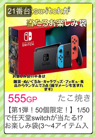 | 任天堂Switch | 設置:有り(抽選) 1PLAY料金:555円相当 |
