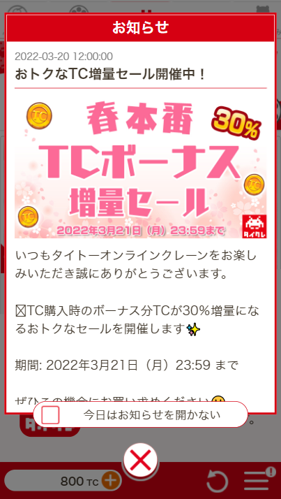 ですがタイクレにログインするとポップアップでイベントの告知が表示されるので気が付けます。