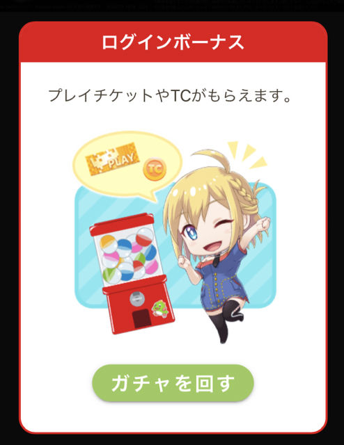 ログインボーナスでは毎日がガチャを引いてTC(タイクレで使えるポイントのこと)をもらえます。