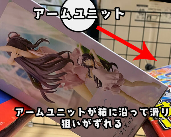 しっかり狙ったつもりが、下降時に箱の傾斜に沿ってアームユニットが手前に滑ってしまうので、この滑ってズレた分を考慮して狙わないといけません。