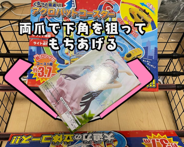 景品側面から挟んでも持ち上がるので、想定より持ち上げすぎてしまって調整がめちゃくちゃ難しい運重視のゲームになりがちなんですよね…