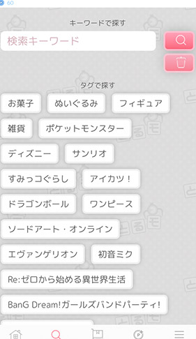 景品検索を簡単で、検索ボタンを押すとこんな画面が表示されるので、目的の景品のタグをタップすれば一発で表示されます。(直接入力検索も使える)