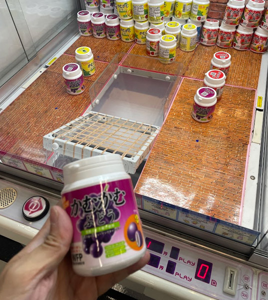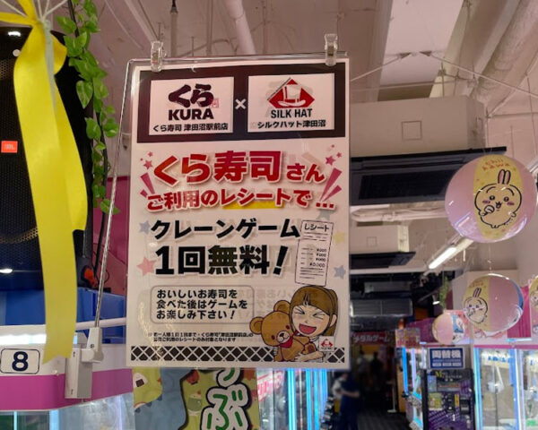 ゲームセンターのお隣さんが「くら寿司」で、レシート提示でクレーンゲームが1プレイ無料で遊べます。